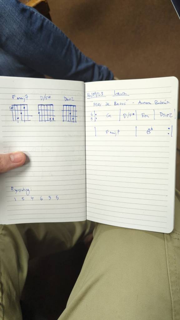 Me preguntó qué quería tocar, y yo decidí que aquí habíamos venido a «hablar de mi libro», así que le solté sin despeinarme un rollo sobre Aurora Beltrán y música española de los 90 que hubiera dejado en shock y con el morro torcido a cualquier británico. Él simplemente sacó el móvil y me pidió ayuda con la ortografía para buscarlo. Empezó a escuchar «Miles de besos» con cara absorta y sacó los acordes en 3 minutos (los músicos profesionales son absolutamente exasperantes por la facilidad que tienen para reconocer cada sonido al instante). Comenzamos poco a poco a reconstruir el tema, ladrillo a ladrillo, para que yo pudiera tocarlo.